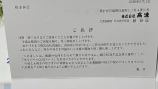 12月権利 <株主優待>7504 (株)高速 2025年12月末 7504 (株)高速より株主優待が到着しました。半年以上100株保有で創立60周年記念オリジナルQUOカード3,000円となります。 2026.02.23 12月権利株主優待