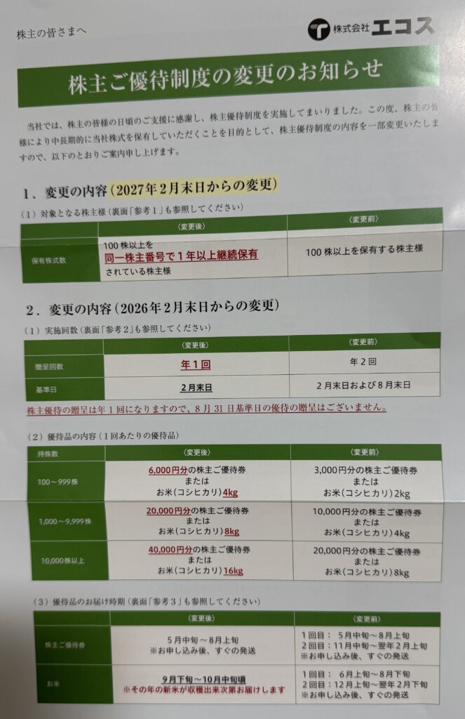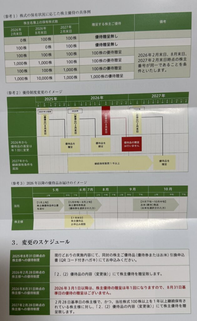 2026年2月末より株主優待制度の変更、2月末と8月末の年2回から年1回に変更。お米は年1回4kgに変更となり、実質変わらず。