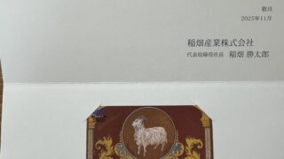 8098 稲畑産業(株)より株主優待が到着しました。3年以上300株保有で5,000円分のQUOカードとなります。3ヶ月毎に株主番号と保有株数のチェックがあります。
